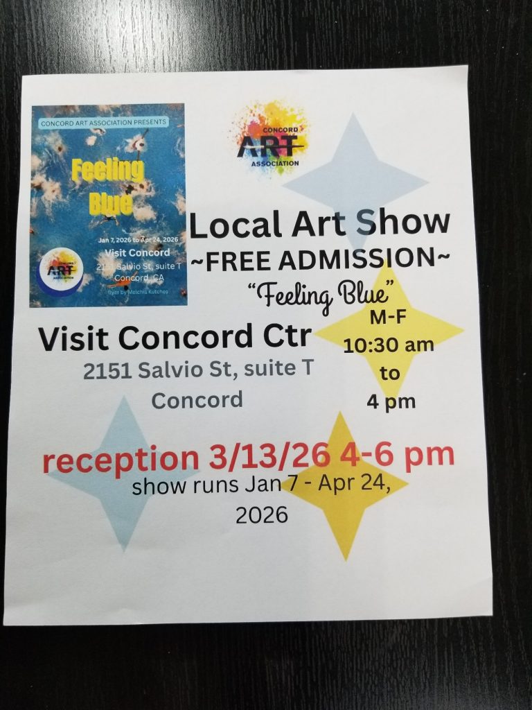 I have one painting in the show Feeling Blue, hosted by the Concord Art Association at Visit Concord, 2151 Salvio St., Ste T, Concord, California, Jan 7-Apr 24, Mon-Fri 10:30-4. Hope to see you there!